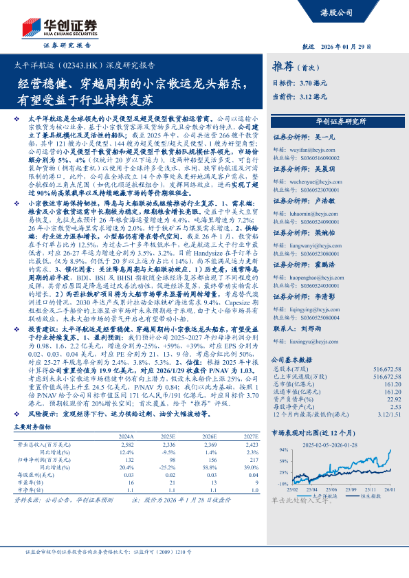 【华创证券】【202601】太平洋航运(02343.HK)深度研究报告 推荐 (首次)经营稳健、穿越周期的小宗散运龙头船东, 有望受益于行业持续复苏-31页
