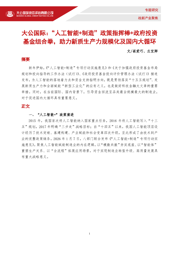 【大公国际】【2026】“人工智能+制造”政策指挥棒+政府投资基金组合拳,助力新质生产力规模化及国内大循环-7页