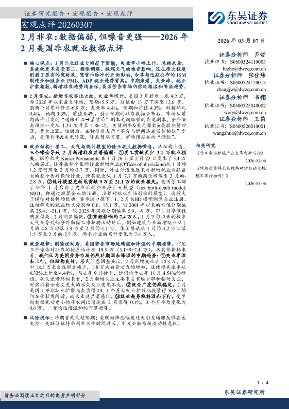 【东吴证券】【202603】2026年 2月美国非农就业数据点评:2月非农:数据偏弱,但噪音更强-4页