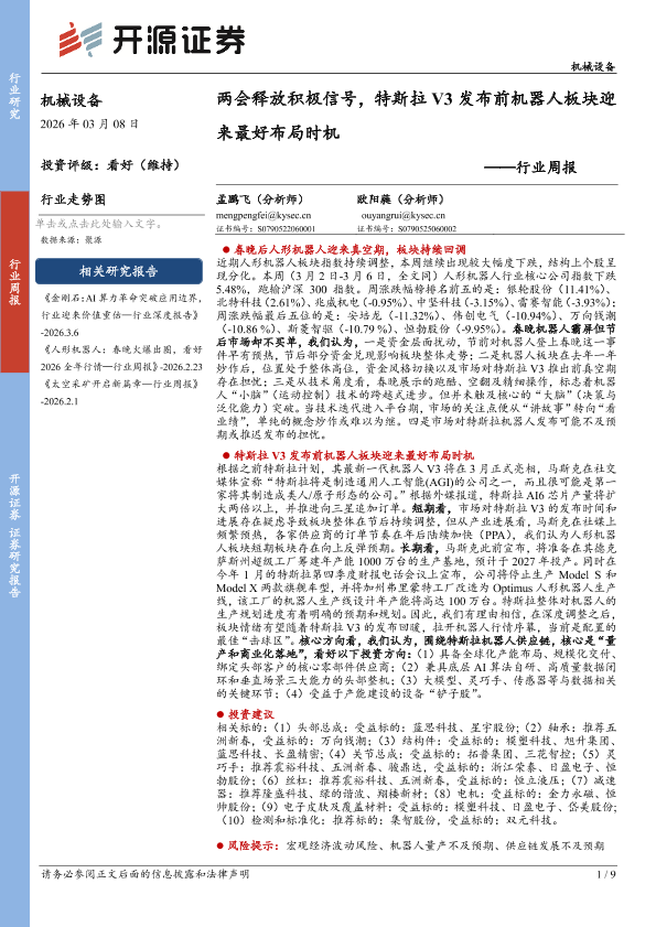【开源证券】【202603】两会释放积极信号,特斯拉 V3发布前机器人板块迎来最好布局时机-9页