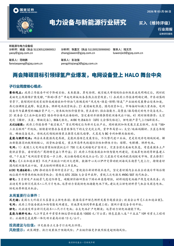 【国金证券】【202603】2026-03-08_国金证券_电力设备与新能源行业研究:两会降碳目标引领绿氢产业爆发,电网设备登上HALO舞台中央.pdf-13页