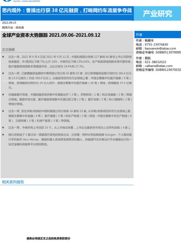 【国泰君安证券】【20210915】全球产业资本大势跟踪:思内观外,曹操出行获38亿元融资,打响网约车流量争夺战-22页