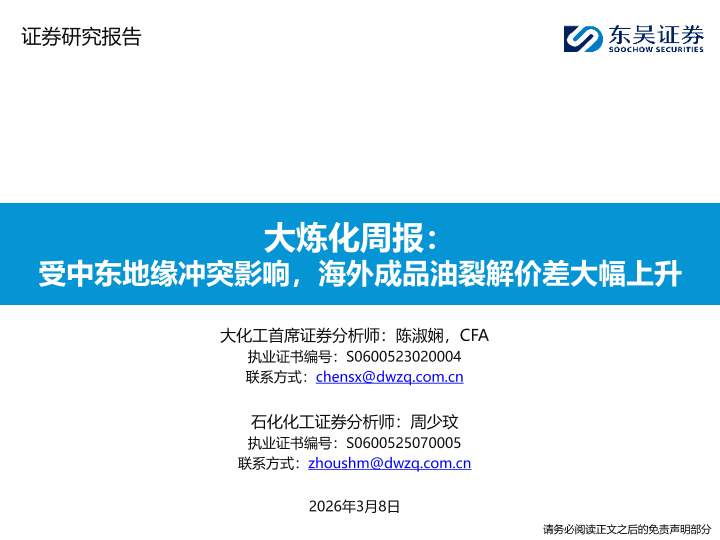 【东吴证券】【202603】大炼化周报:受中东地缘冲突影响,海外成品油裂解价差大幅上升-34页