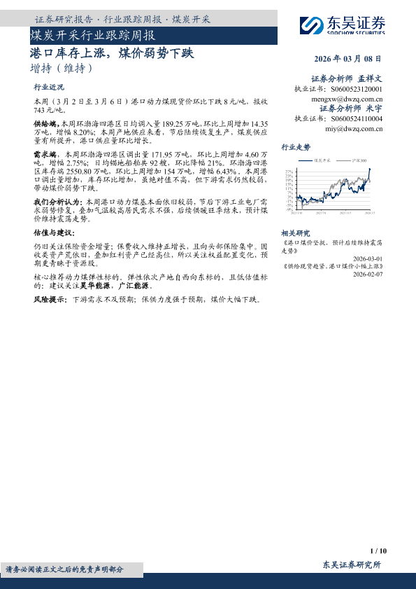 【东吴证券】【202603】煤炭开采行业跟踪周报:港口库存上涨,煤价弱势下跌-10页