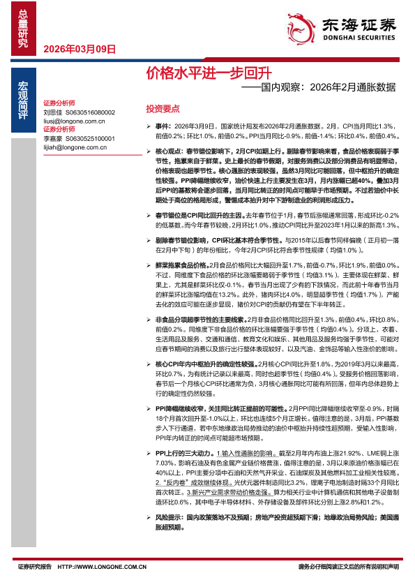 【东海证券】【202603】国内观察:2026年2月通胀数据:价格水平进一步回升-5页