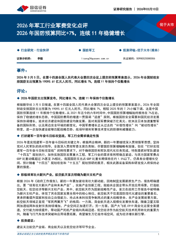 【国信证券】【202603】2026年军工行业军费变化点评:2026年国防预算同比+7%,连续11年稳健增长-4页