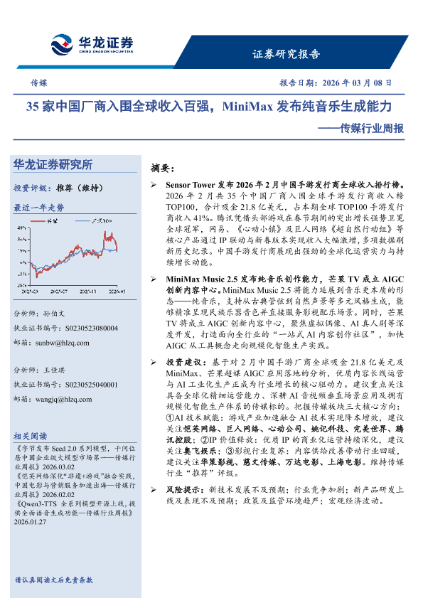【华龙证券】【202603】35家中国厂商入围全球收入百强,MiniMax发布纯音乐生成能力-11页