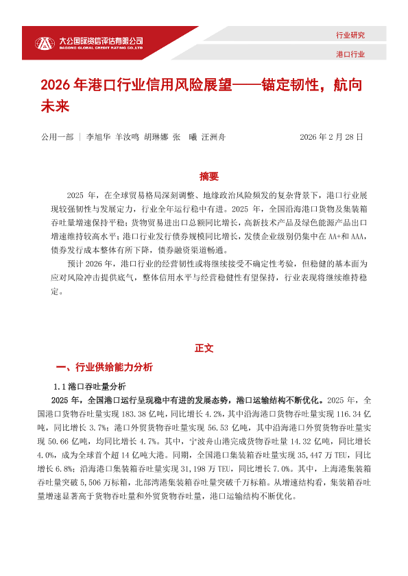 【大公国际】【202602】2026年港口行业信用风险展望——锚定韧性,航向未来-12页