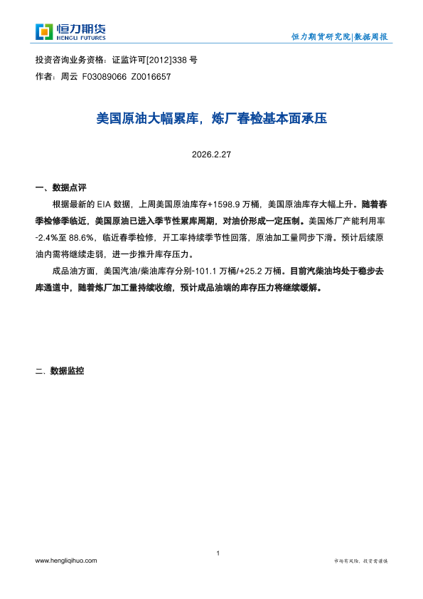 【恒力期货】【202602】美国原油大幅累库,炼厂春检基本面承压-3页