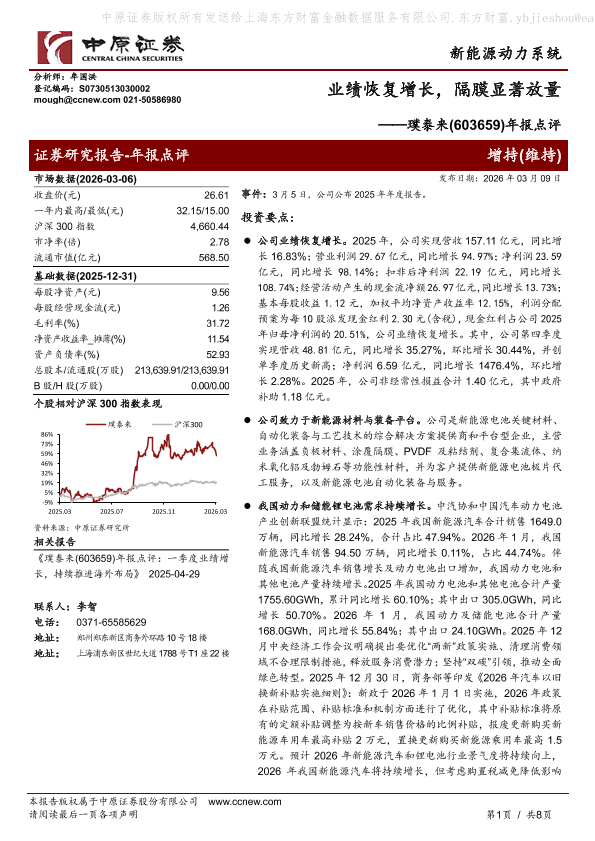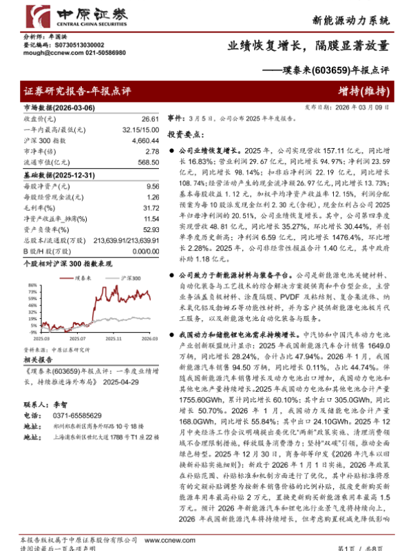 【中原证券】【202603】业绩恢复增长,隔膜显著放量——璞泰来(603659)年报点评-8页