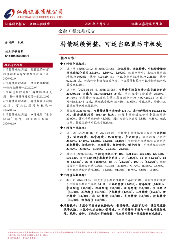 【江海证券】【202603】转债延续调整,可适当配置防守板块-12页