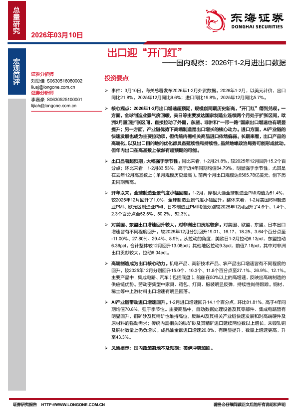 【东海证券】【202603】出口迎“开门红”——国内观察:2026年1-2月进出口数据-5页