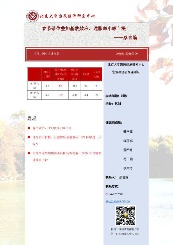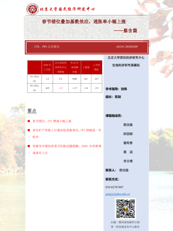 【北京大学国民经济研究中心】【202603】CPI、PPI点评报告 A0101-20260309——春节错位叠加基数效应,通胀率小幅上涨-9页
