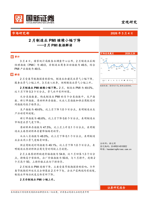 【国新证券】【202603】2月PMI数据解读:2月制造业PMI继续小幅下降-3页
