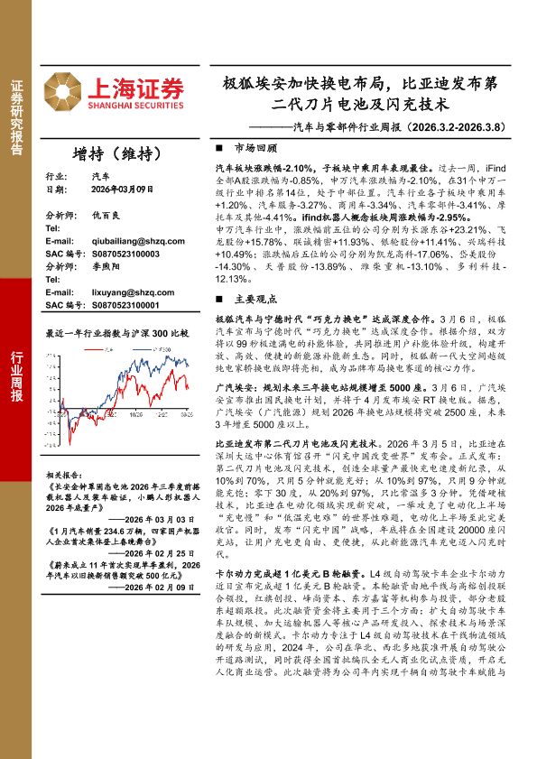 【上海证券】【202603】汽车与零部件行业周报:极狐埃安加快换电布局,比亚迪发布第二代刀片电池及闪充技术-3页