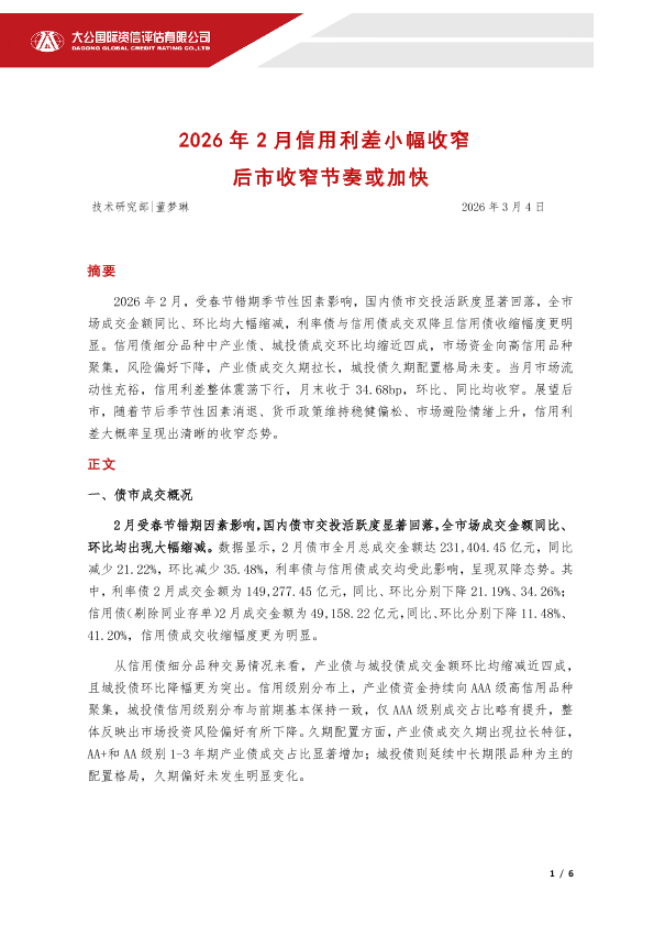 【大公国际】【202602】2026年2月信用利差小幅收窄 后市收窄节奏或加快-6页