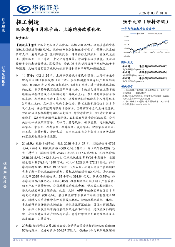 【华福证券】【202603】轻工制造行业定期报告:纸企发布3月涨价函,上海购房政策优化-21页