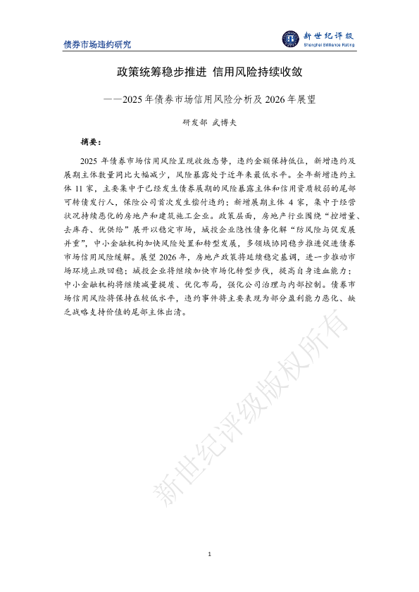 【研发部 武博夫】【2025】政策统筹稳步推进 信用风险持续收敛——2025年债券市场信用风险分析及 2026年展望-18页