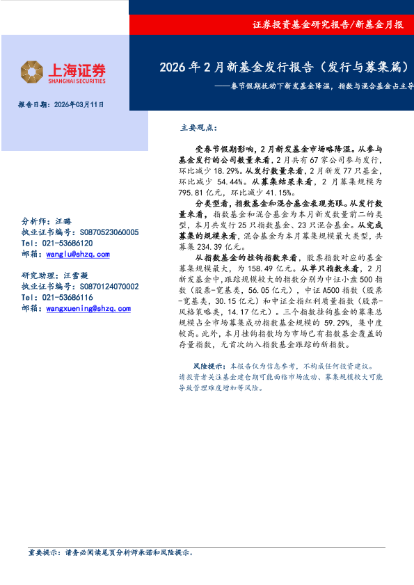 【上海证券】【202603】2026年2月新基金发行报告(发行与募集篇)——春节假期扰动下新发基金降温,指数与混合基金占主-9页