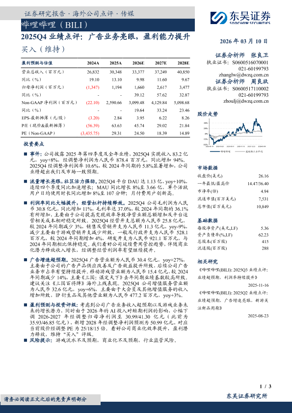 【东吴证券】【202603】2025Q4业绩点评:广告业务亮眼,盈利能力提升-3页