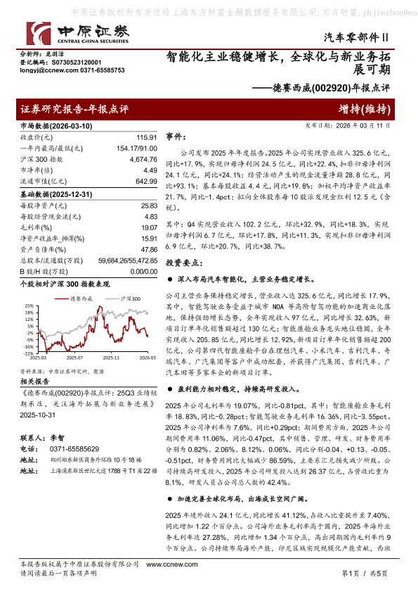 【中原证券】【202603】智能化主业稳健增长,全球化与新业务拓展可期——德赛西威(002920)年报点评-5页