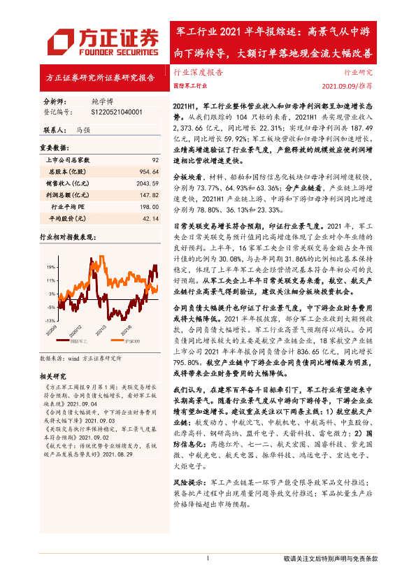 【方正证券】【20210909】军工行业2021半年报综述:高景气从中游向下游传导,大额订单落地现金流大幅改善-19页