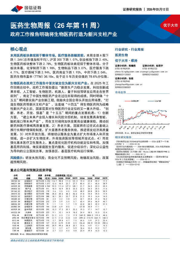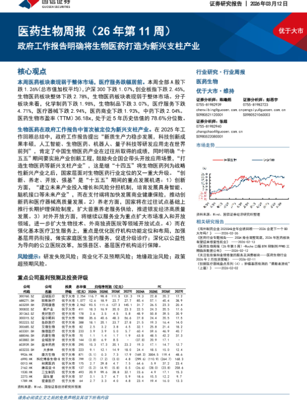 【国信证券】【202603】医药生物周报(26年第 11周)政府工作报告明确将生物医药打造为新兴支柱产业-15页