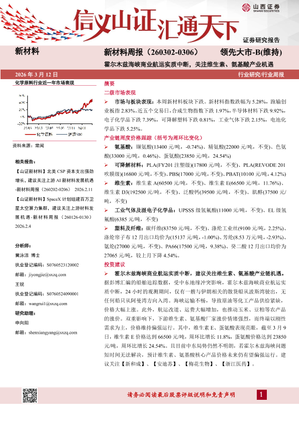 新材料 霍尔木兹海峡 航运中断 氨基酸 维生素