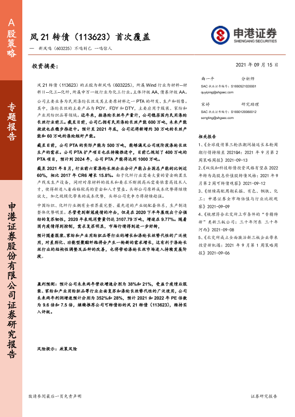 【申港证券】【20210915】凤21转债(113623)首次覆盖:新凤鸣(603225),不鸣则已,一鸣惊人-29页