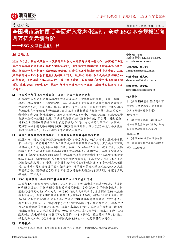 【浙商证券】【202603】全国碳市场扩围后全面进入常态化运行,全球 ESG基金规模迈向 四万亿美元新台阶——ESG及绿色金融月报-24页