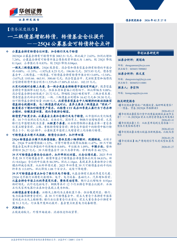 【华创证券】【202602】25Q4公募基金可转债持仓点评:一二级债基增配转债,转债基金仓位提升-24页