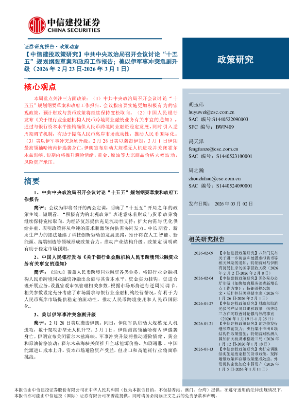 【中信建投证券】【202603】中共中央政治局召开会议讨论“十五五”规划纲要草案和政府工作报告;美以伊军事冲突急剧升级-11页