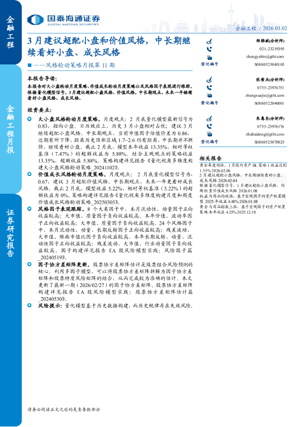 【国泰海通证券研究所】【202603】2026年03月10日更新-【国泰海通】风格轮动策略月报第11期:3月建议超配小盘和价值风格,中长期继续看好小盘、成长风格-17页