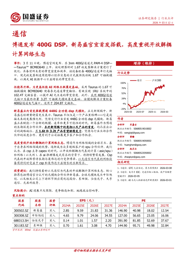 【国盛证券】【202603】通信行业点评_博通发布400G_DSP_新易盛官宣首发搭载_高度重视开放解耦计算网络生态-2页