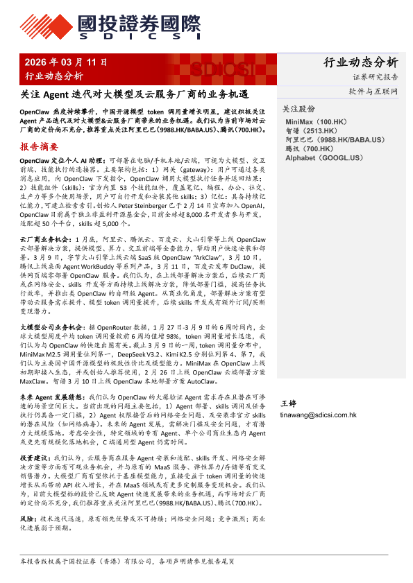 【国投证券国际】【202603】2026年03月11日行业动态分析-关注Agent迭代对大模型及云服务厂商的业务机遇-6页