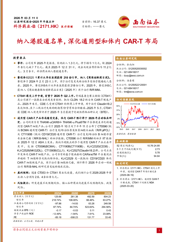 【西南证券】【2025】纳入港股通名单,深化通用型和体内 CAR-T布局-6页