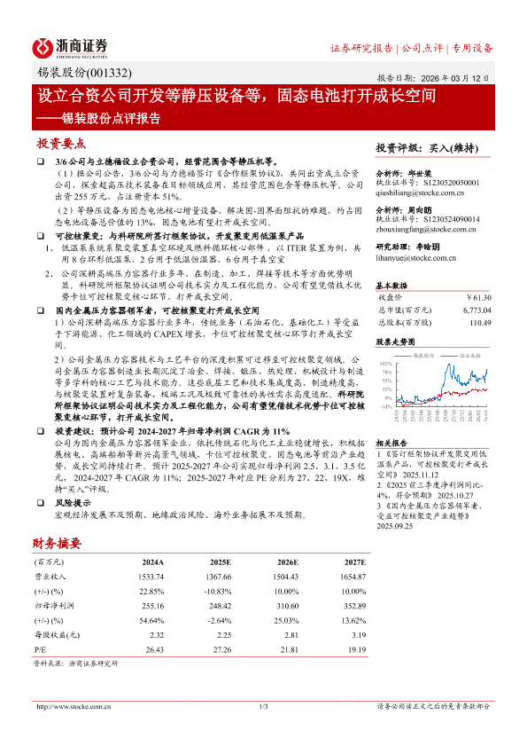 【浙商证券】【2025】设立合资公司开发等静压设备等,固态电池打开成长空间——锡装股份点评报告-3页