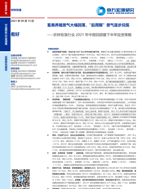 【申万宏源】【20210915】农林牧渔行业2021年中报回顾暨下半年投资策略:畜禽养殖景气大幅回落,“后周期”景气逐步兑现-36页