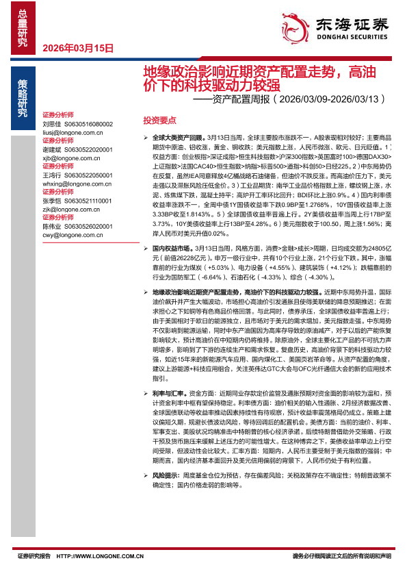 【东海证券】【202603】地缘政治影响近期资产配置走势,高油价下的科技驱动力较强-27页