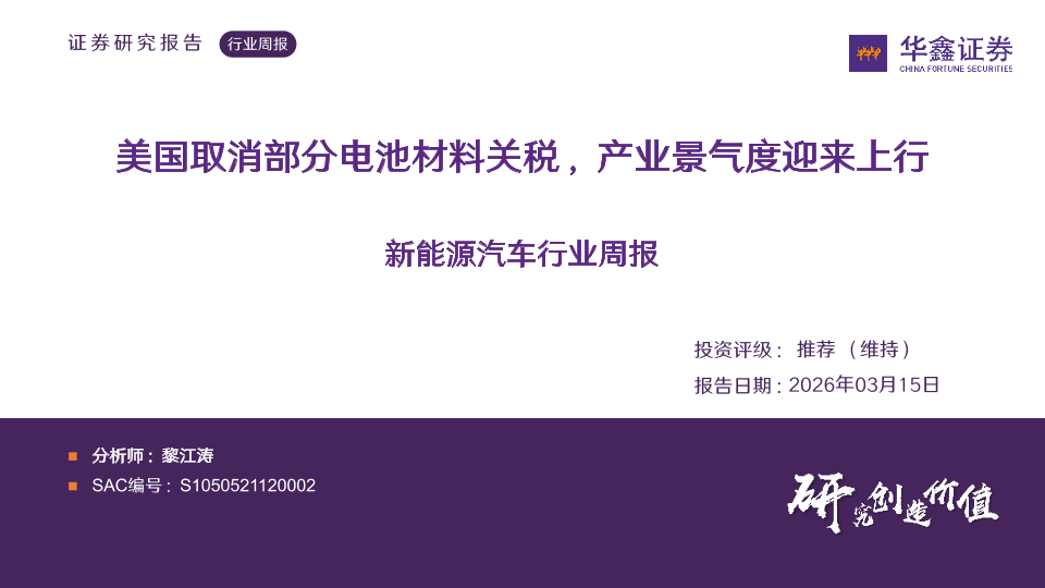 【华鑫证券】【202603】美国取消部分电池材料关税,产业景气度迎来上行新能源汽车行业周报-32页