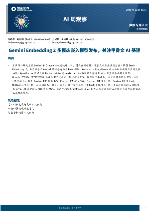 【国金证券】【202503】AI周观察:Gemini Embedding 2多模态嵌入模型发布,关注甲骨文AI基建-7页
