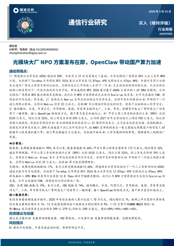 【国金证券】【202503】通信行业研究:光模块大厂NPO方案发布在即,OpenClaw带动国产算力加速-11页