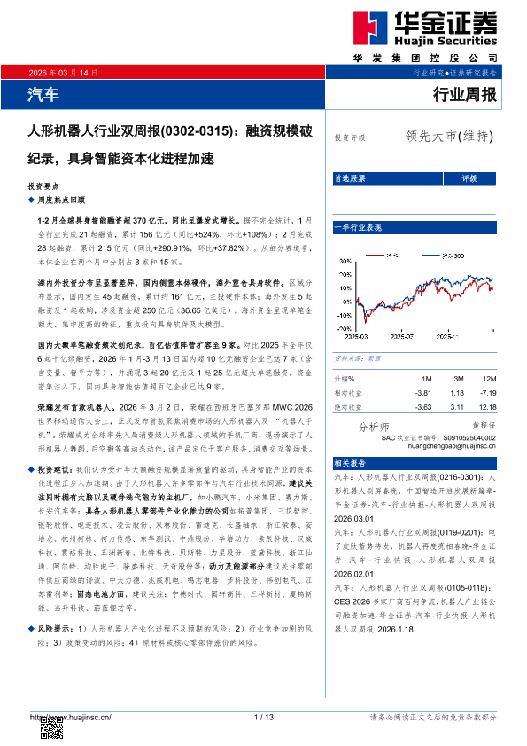 【华金证券】【202603】人形机器人行业双周报(0302-0315):融资规模破纪录,具身智能资本化进程加速-13页