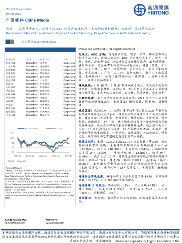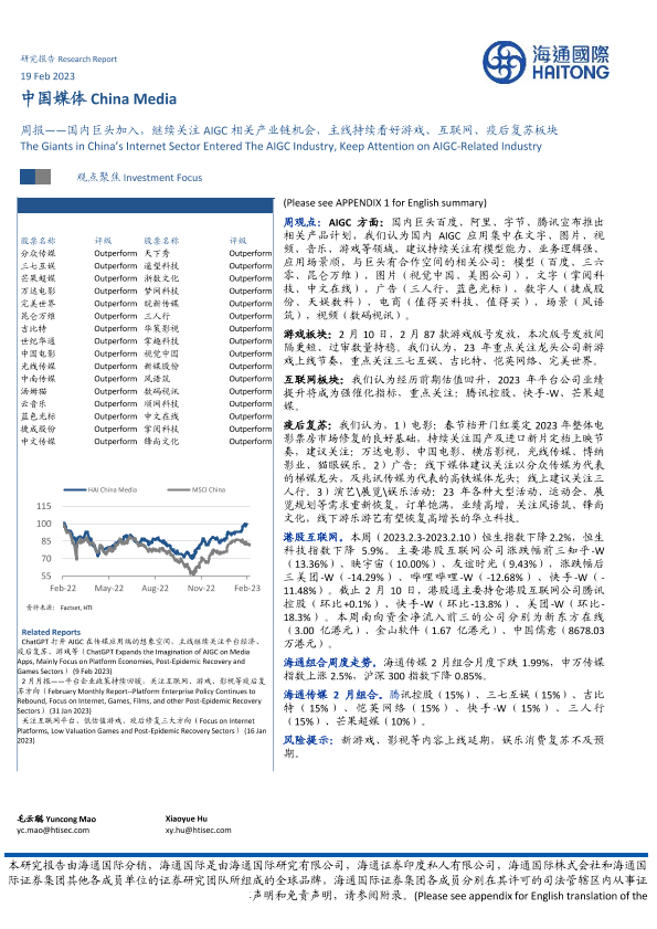 【海通国际】【20230219】中国媒体行业周报:国内巨头加入,继续关注AIGC相关产业链机会,主线持续看好游戏、互联网、疫后复苏板块-16页