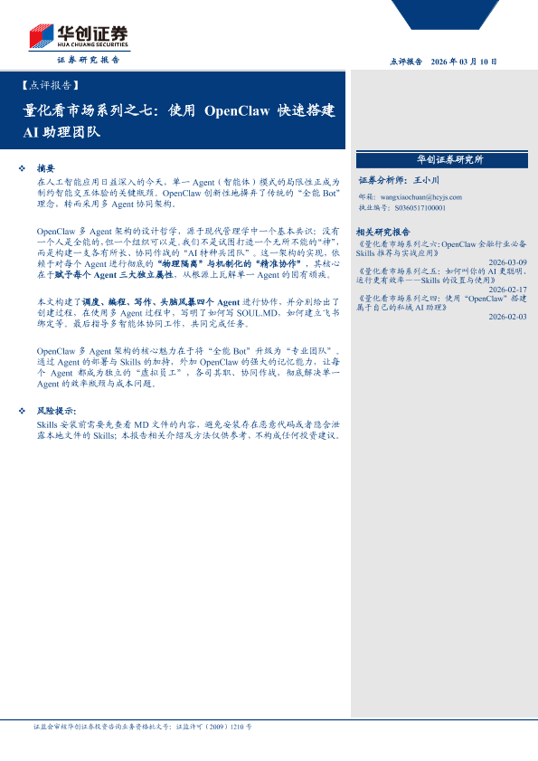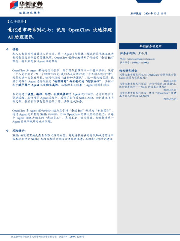 【华创证券】【202603】量化看市场系列之七:使用OpenClaw快速搭建AI助理团队-21页