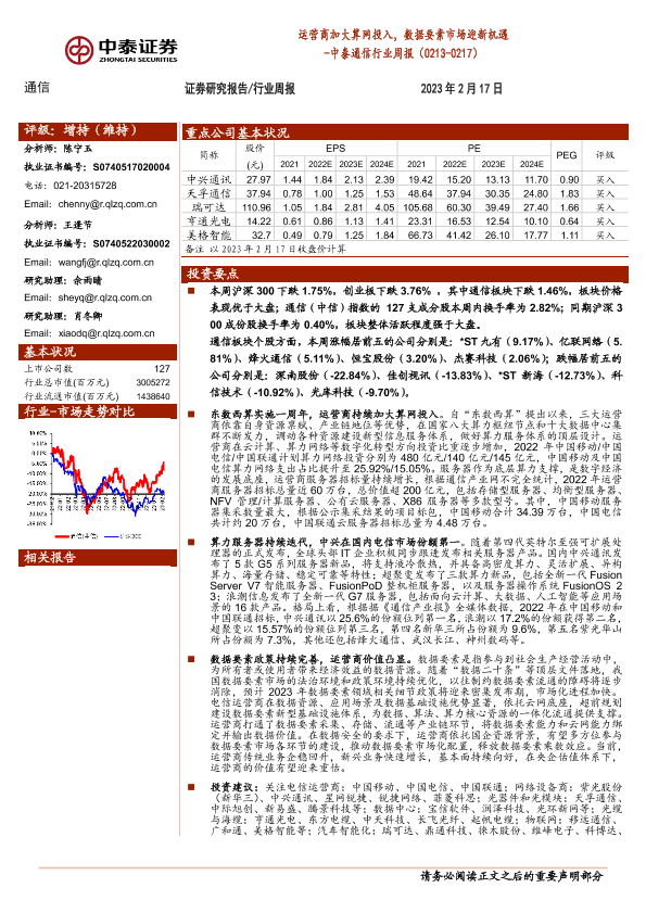 【中泰证券】【20230217】中泰通信行业周报:运营商加大算网投入,数据要素市场迎新机遇-19页