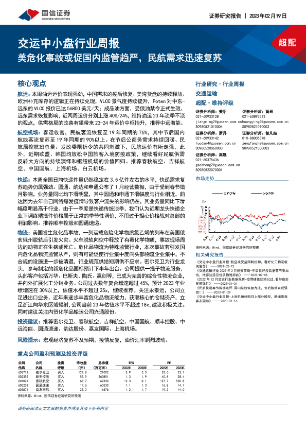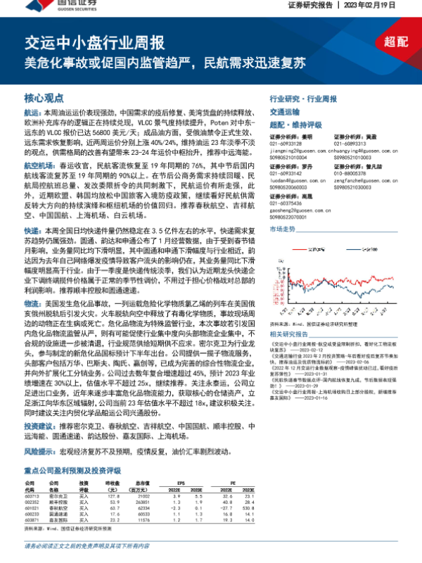 【国信证券】【20230219】交运中小盘行业周报:美危化事故或促国内监管趋严,民航需求迅速复苏-15页