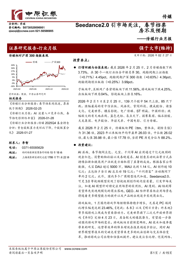 【中原证券】【2026】Seedance2.0引市场关注,春节档票房不及预期-15页