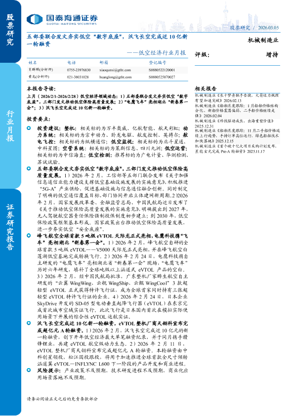 【国泰海通证券】【202602】五部委联合发文夯实低空“数字底座”,沃飞长空完成近 10亿新一轮融资——低空经济行业月报-12页
