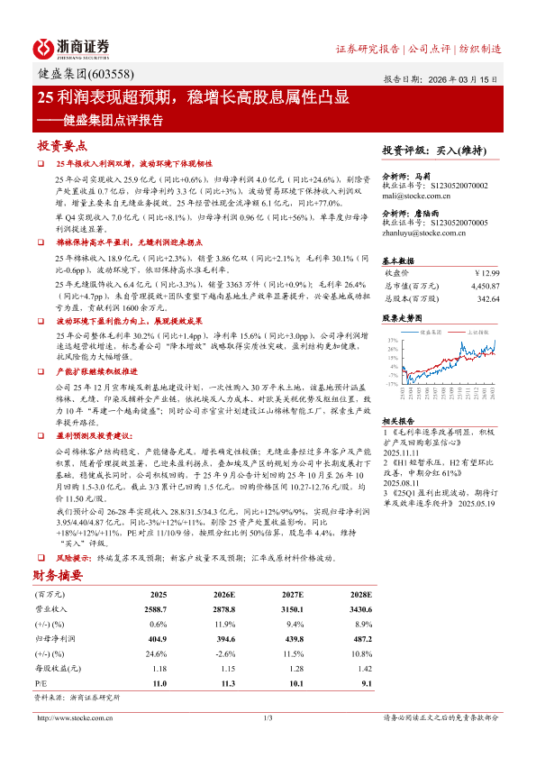 【浙商证券】【2025】25利润表现超预期,稳增长高股息属性凸显——健盛集团点评报告-3页